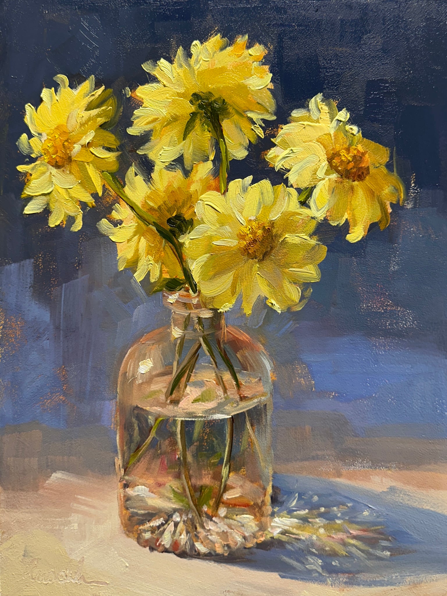 I love painting the drama of intense sunshine so today I made sure I was in my studio just when the light would be beaming through the window. These special dahlias are homegrown by me 😃 and possibly the only ones I’ll get in the garden this season due to the bugs. 😭
