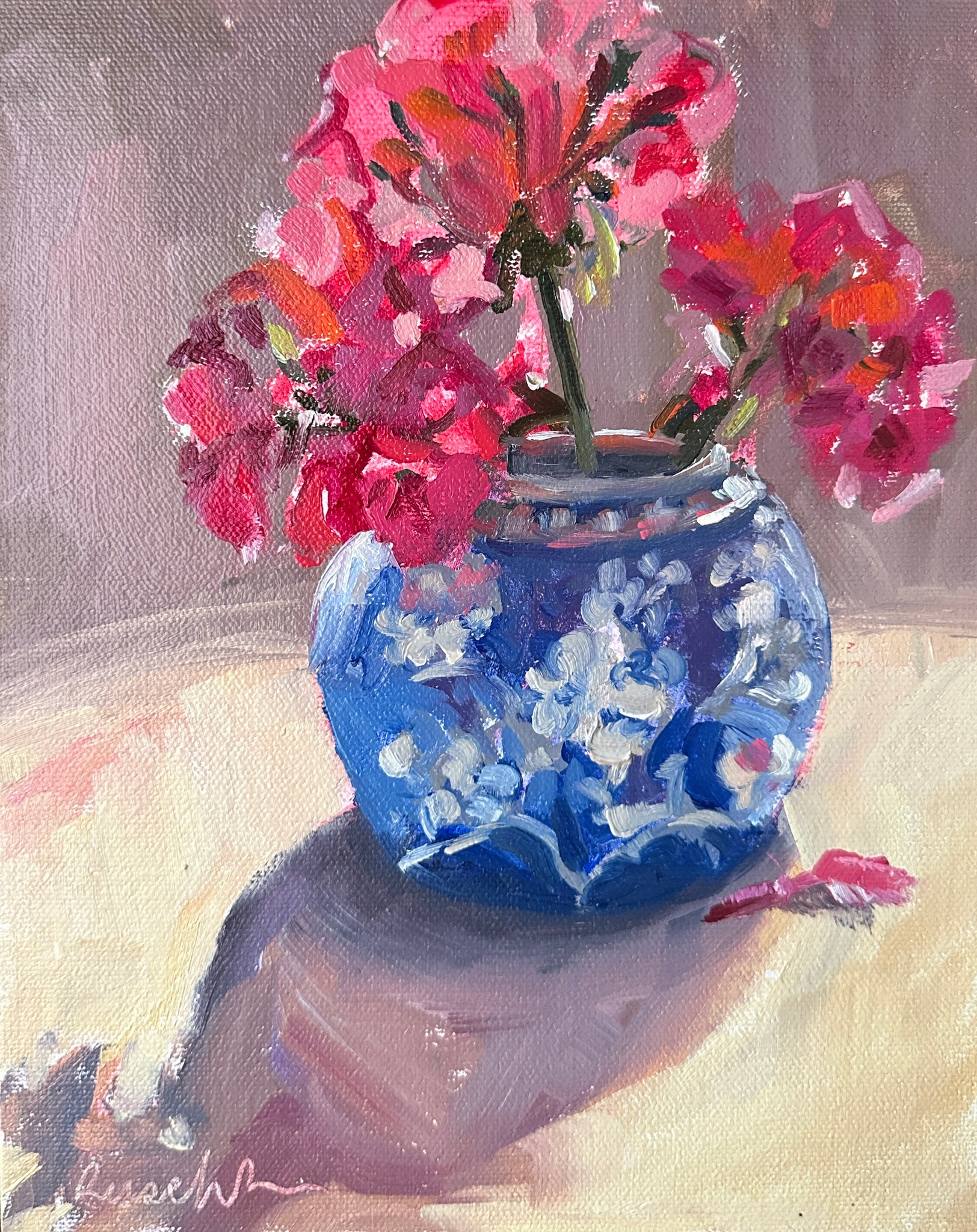 Geraniums in the window sun. There’s no pigment that can capture that glow.